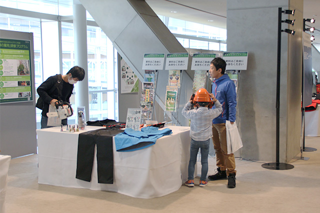 ステージブースにて、司会進行役として女優の葛城奈海さんを迎え、現場で活躍している緑の研修生とのトークショーを行いました。今年度は森林の仕事や暮らしでのエピソードに加え、自分らしく生きるために大切にしていることを紹介してもらいました。実際に現場で働く方の話が聞けるためか、トークショー開始時には大勢の来場者が集まり、満席のため立ち見でご覧になる方もいらっしゃいました。