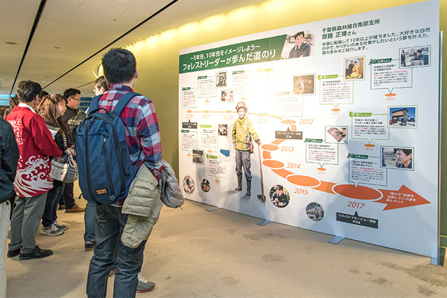 今回のガイダンスでは、さらに経験の積んだフォレストリーダーやフォレストマネージャーとのトークショーを行い、今まで歩んだ道のりや長年やってきたからこそ実感する林業の魅力などを交えながら対談が進められました。来場者の方々はトークショーを通して、5年先10年先の自分の姿をイメージできたのではないでしょうか。また、展示ブースにてフォレストリーダーの歩んだ道のりのパネルを設置し、こちらも多くの来場者が足を止めパネルを見ていました。