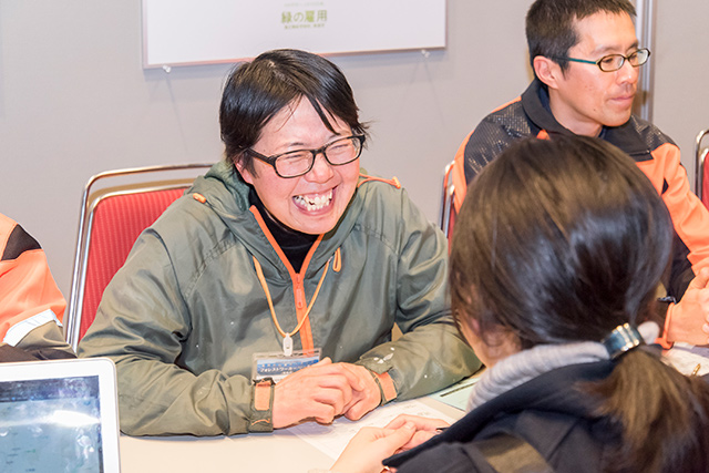1月26日東京会場では、様々な地域のフォレストワーカーの方々に参加いただき、2回のトークショーを行いました。登壇いただいたフォレストワーカーの方は、元自衛官の方、同じ林業事業体の事務から現場作業員へ移った方など、今の仕事に就いた経緯も様々で、現場の大変さや良いことなど実体験を交えてお話しいただきました。
