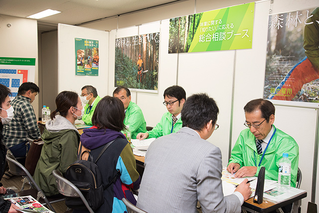 東京会場の翌月の11月16日(土)に大阪OMMにて「森林の仕事ガイダンス」を開催しました。今年は大阪開催過去最高の全国31道府県から林業労働力確保支援センター等が集まり、出展した各ブースでは、林業に関する質問や相談が多くされていました。