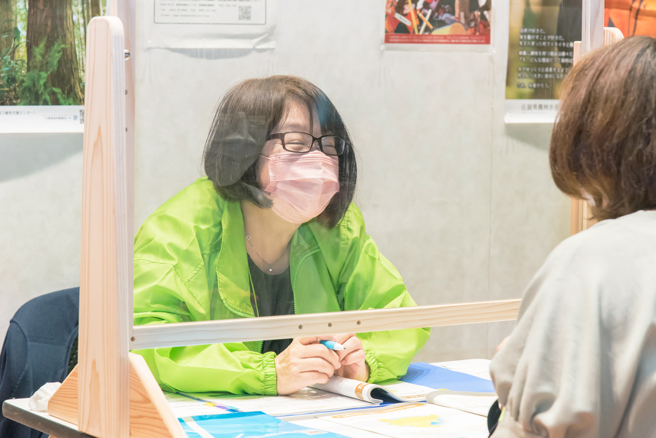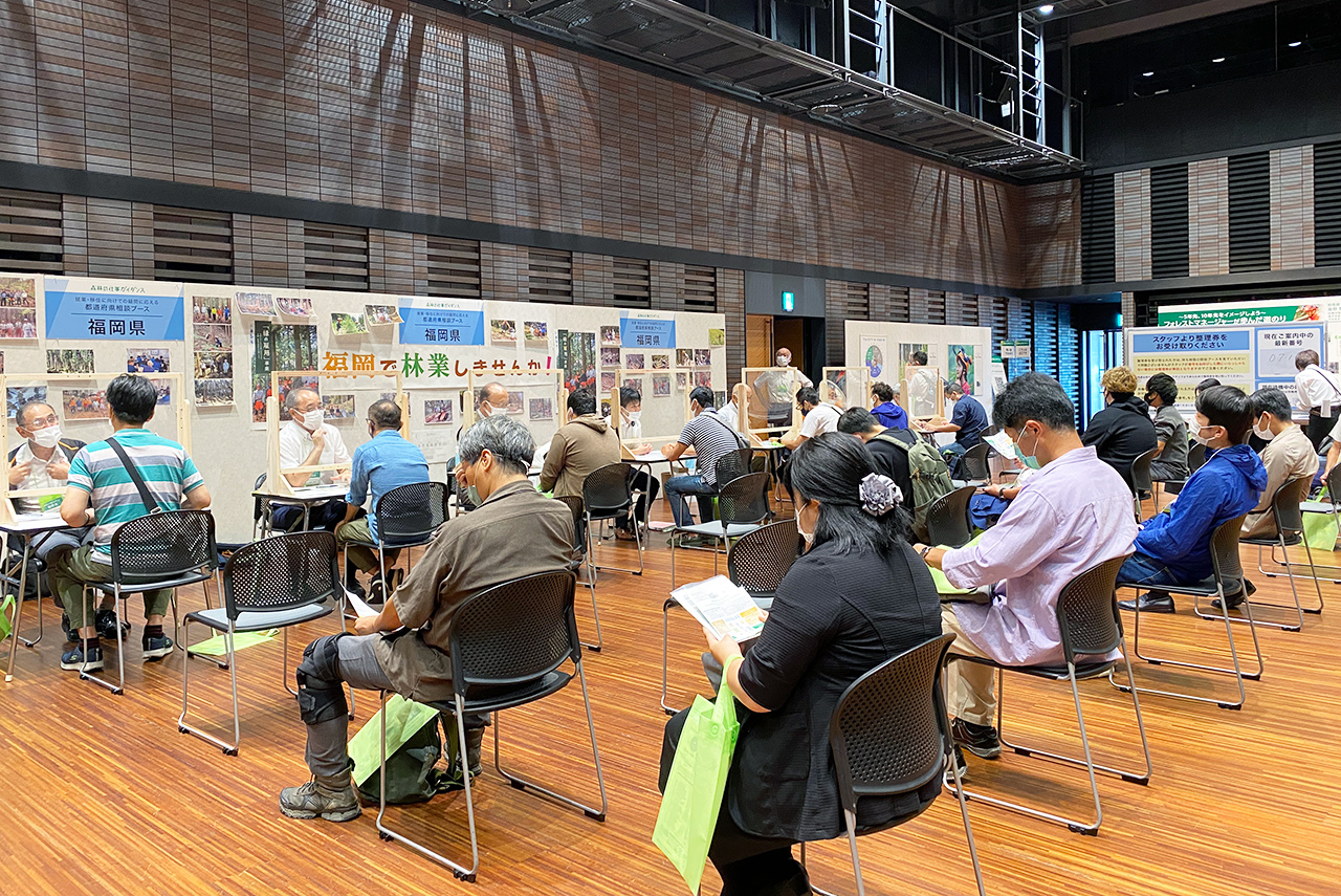 また、福岡会場では、前回の名古屋会場では緊急事態宣言の関係から実現できなかった「フォレストワーカー相談ブース」が設置され、「実際に林業の現場で働いている『緑の雇用』の研修生であるフォレストワーカーから生の声を聞くことができる」と多くの方が相談に訪れ、森林・林業の仕事への理解を深められていました。