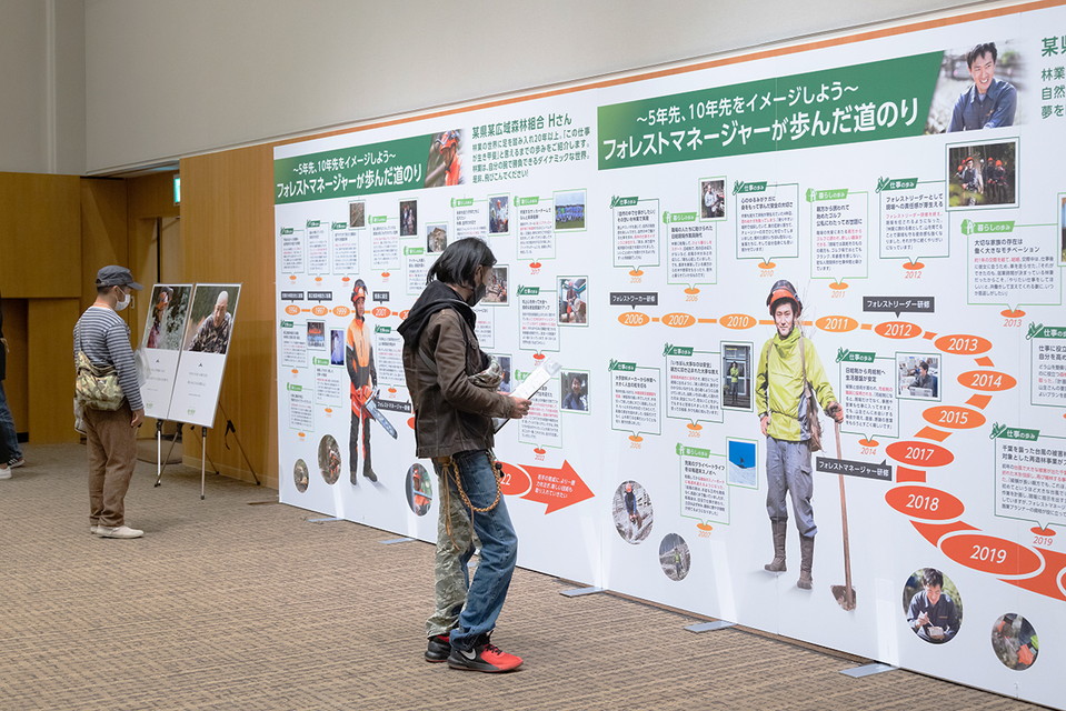 本年度のメインビジュアルコピーは、“はじめよう、林業ライフ”です。林業ライフとは、自然の中に身を置き、ワークライフバランスを取る林業従事者の生活のことを指しています。コロナ禍で従来の働き方が見直される中、今こそ「林業の世界の一歩」を踏み出す絶好の機会であることを明るく前向きに表現させていただきました。