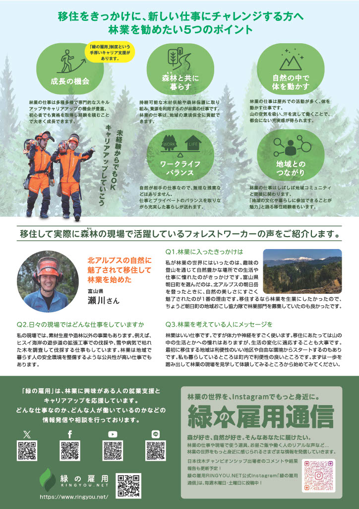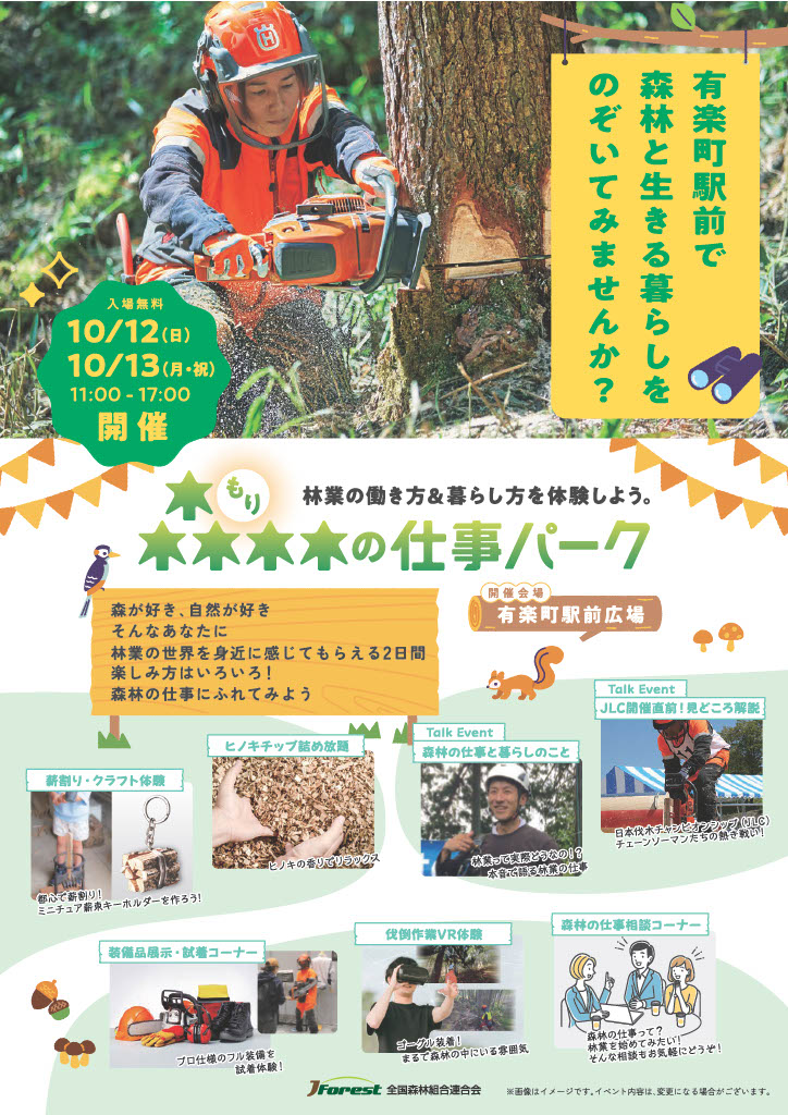 森林の仕事パークを10/12・13日に有楽町駅前広場にて開催します。2025/8/25 都市の真ん中で森林体験! 森林とつながり、はたらき、あそぶ! 「森林(もり)の仕事パーク」では、森林や林業の魅力をまるごと体験できます。 VRによる伐倒作業の疑似体験、木工製品づくり、森林で働くプロフェッショナルによるトークショーなど、楽しみながら森林の魅力を感じられるイベントです。 前のページへ戻る